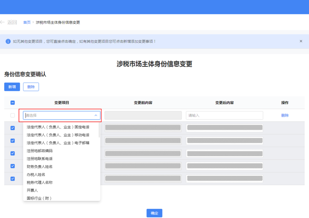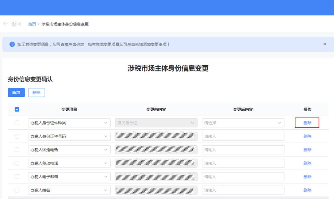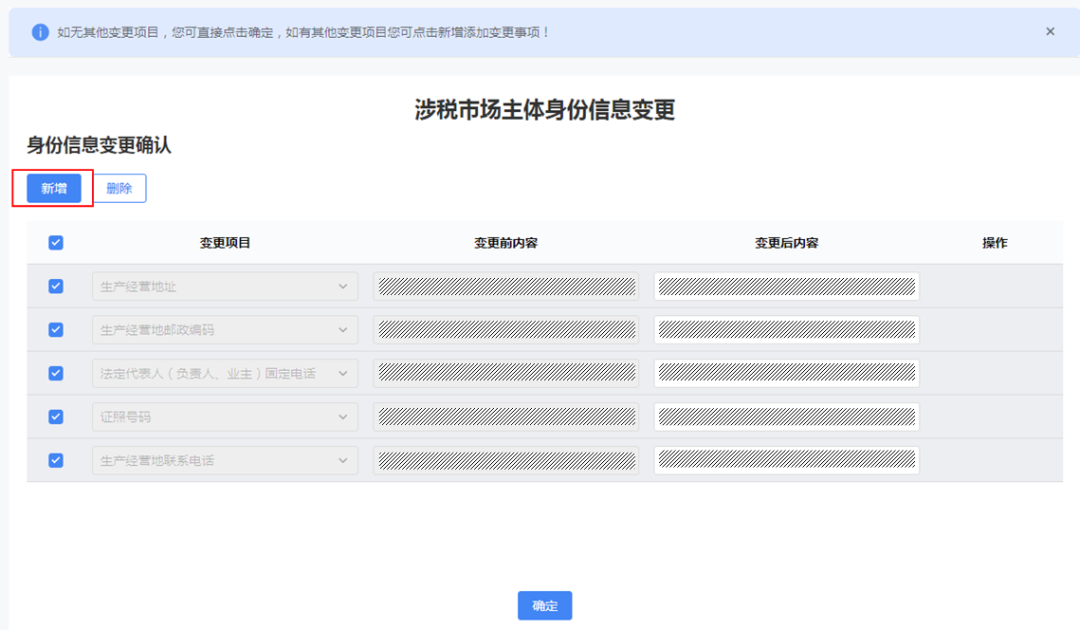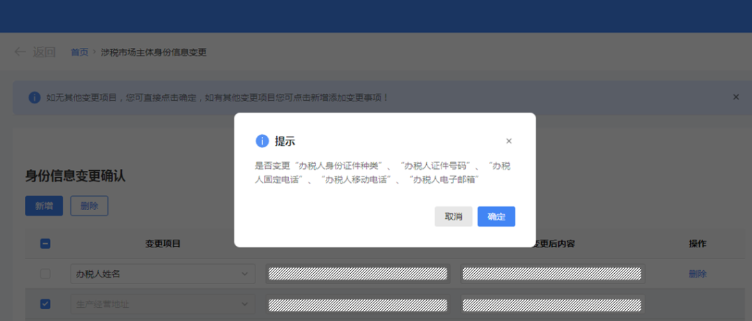 系统弹出提示:是否变更“办税人身份证件种类”、“办税人证件号码”、“办税人固定电话”、“办税人移动电话”、“办税人电子邮箱”,这里点击“取消”,需要手动添加变更项目;点击“确定”,系统将自动添加上述变更项目。