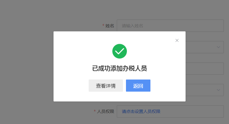 填完信息后,点击“确定”,跳出提示框,点击“确定”,显示“已成功添加办税人员”。
