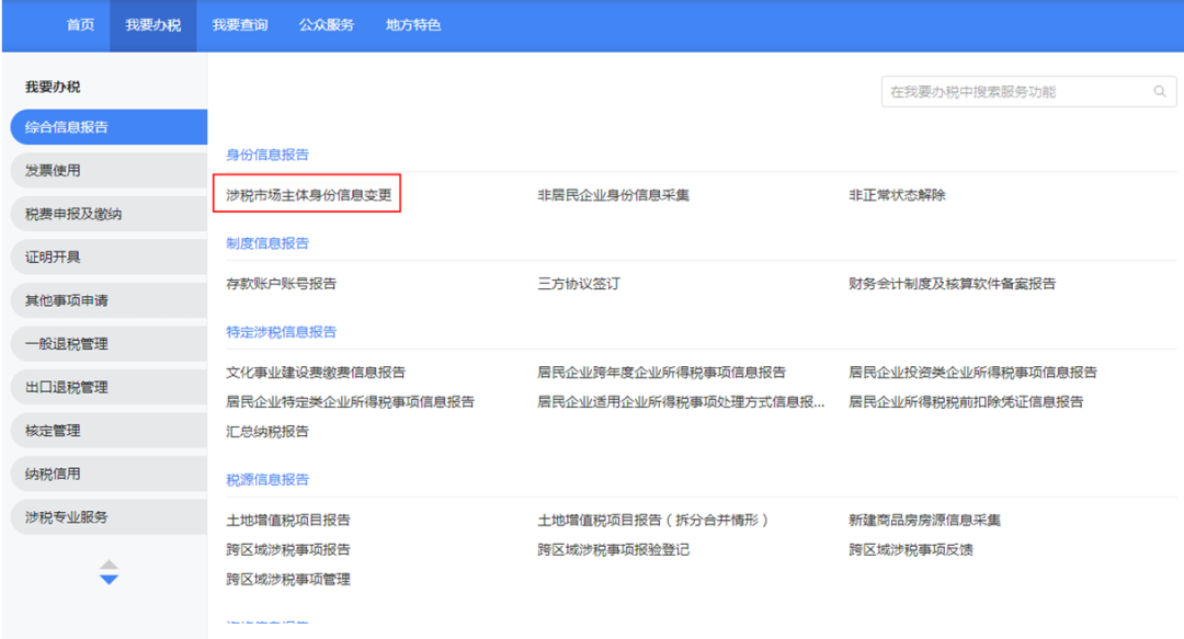 法人或财务负责人登录新电子税局,点击“我要办税”,点击“综合信息报告”,点击“身份信息报告”下的“涉税市场主体身份信息变更”。