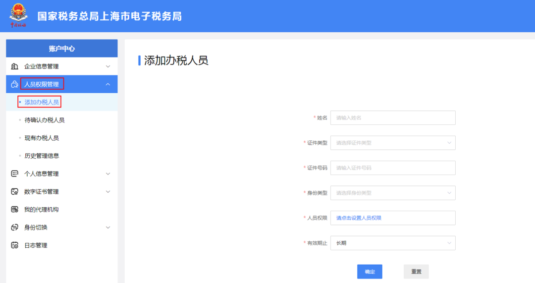 在弹出的页面左侧,选择“人员权限管理”,点击“添加办税人员”,在右侧页面,输入相关信息添加办税员。