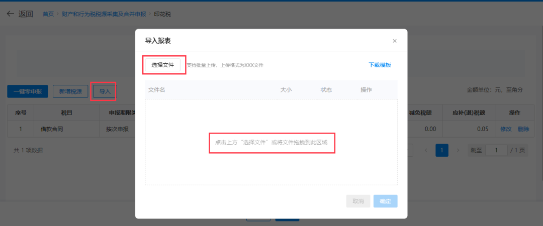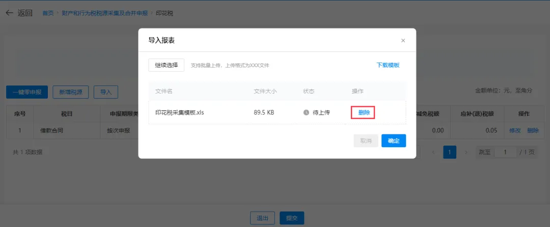 若需批量导入印花税税源信息,可点击【导入】进入页面选【下载模板】,下载《印花税信息采集模板》,在表中填入需要采集的相关信息。
