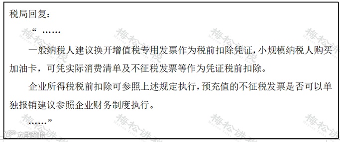 3、可以报销≠可以税前扣除。对于预付卡开具不征税发票的,还要证明“支出实际发生”,才能构成完整的税前扣除凭证。 一般纳税人建议换开增值税专用发票作为税前扣除凭证,小规模纳税人购买加油卡,可凭实际消费清单及不征税发票等作为凭证税前扣除。