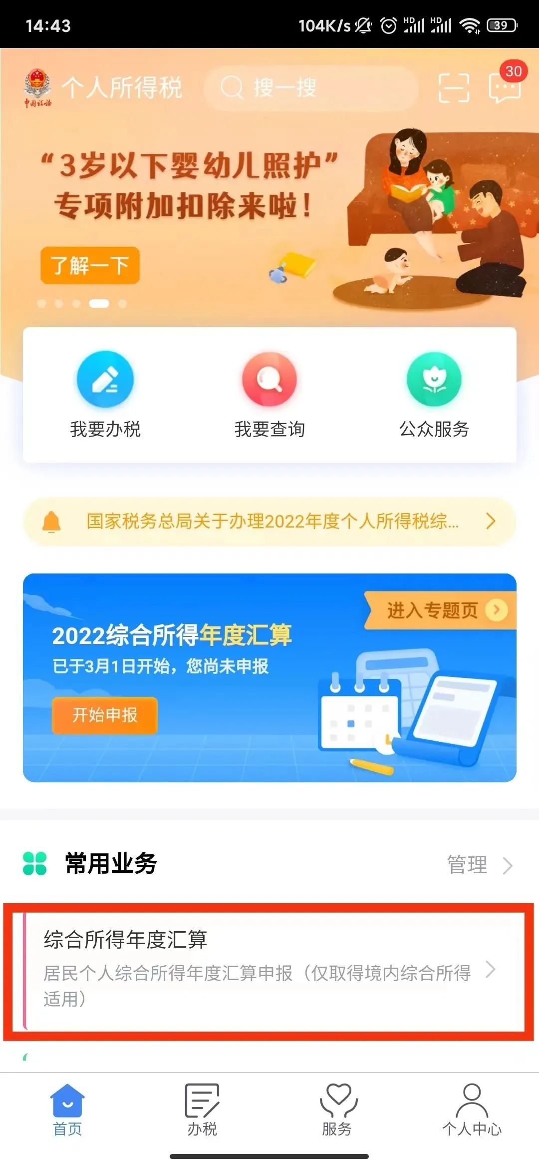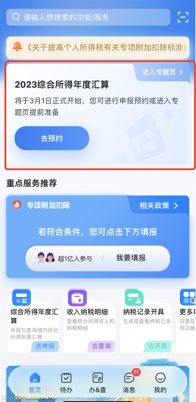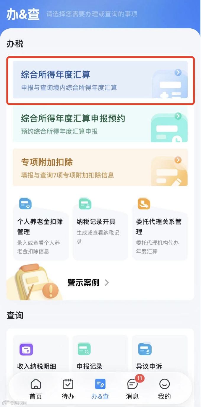 首页【2023综合所得年度汇算】;或者首页【办&查】——【综合所得年度汇算】。