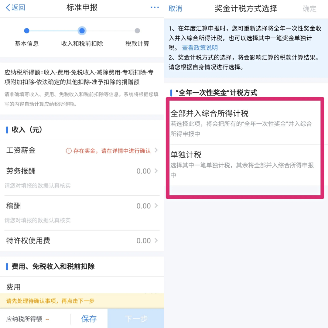 汇缴年度取得年终奖,且任职单位已按照“全年一次性奖金”申报的情况,是否并入综合所得进行汇算清缴,需个人根据实际情况自行判断,具体操作步骤: