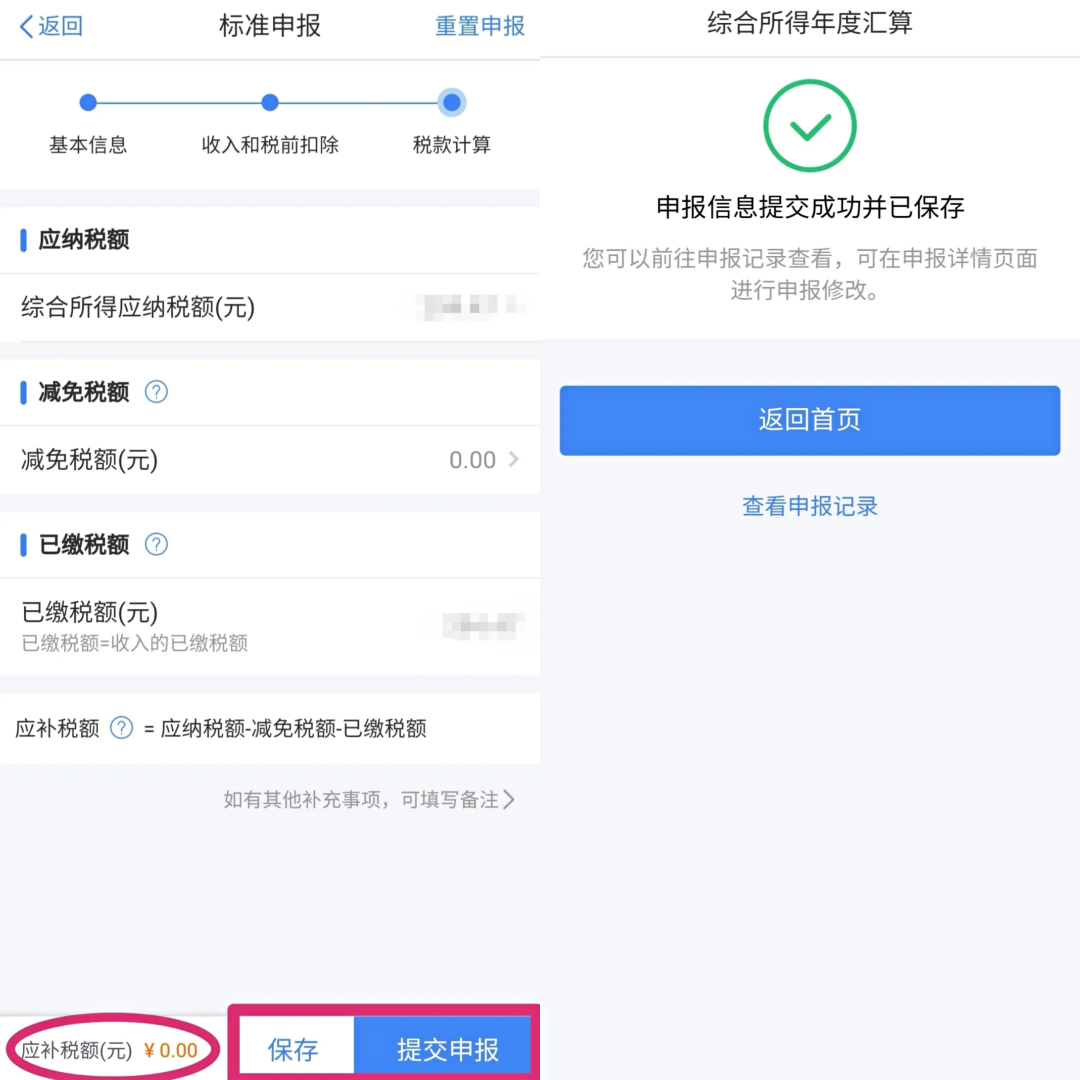 进入到下一界面,请对“收入”、“费用”、“免税收入和税前扣除”等项目一一核对或填报→点击“下一步”→系统根据计算结果在左下方显示“应补税额”或“应退税额”→核对无误后点击“提交申报”→勾选“我已阅读并同意”→点击“确认”,即可完成申报。