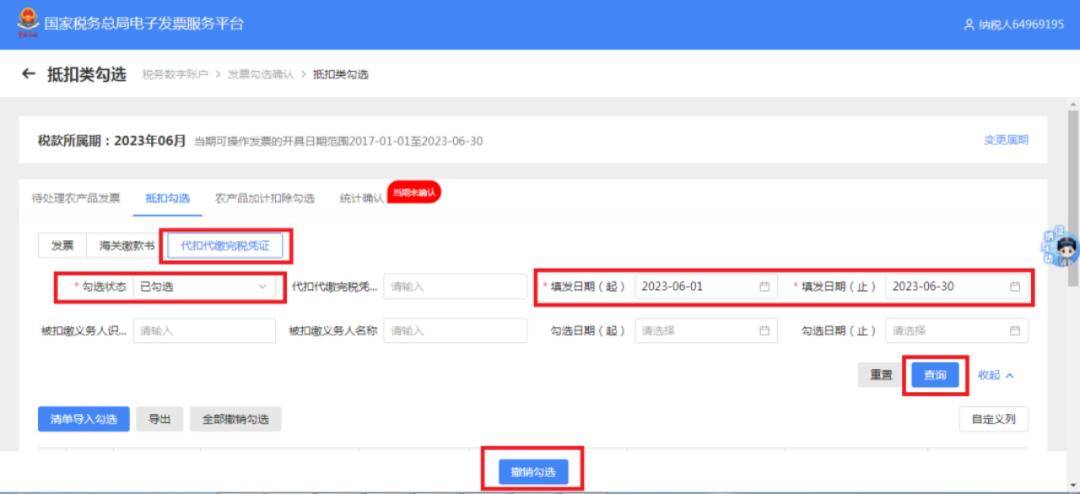 若需要撤销勾选,则勾选状态选择【已勾选】,选择好【查询日期起止】,然后点击【查询】按钮,可查询到当前税款所属期已勾选的代扣代缴完税凭证信息。勾选要撤销的发票信息,点击【撤销勾选】按钮,提示提交成功即完成撤销勾选。