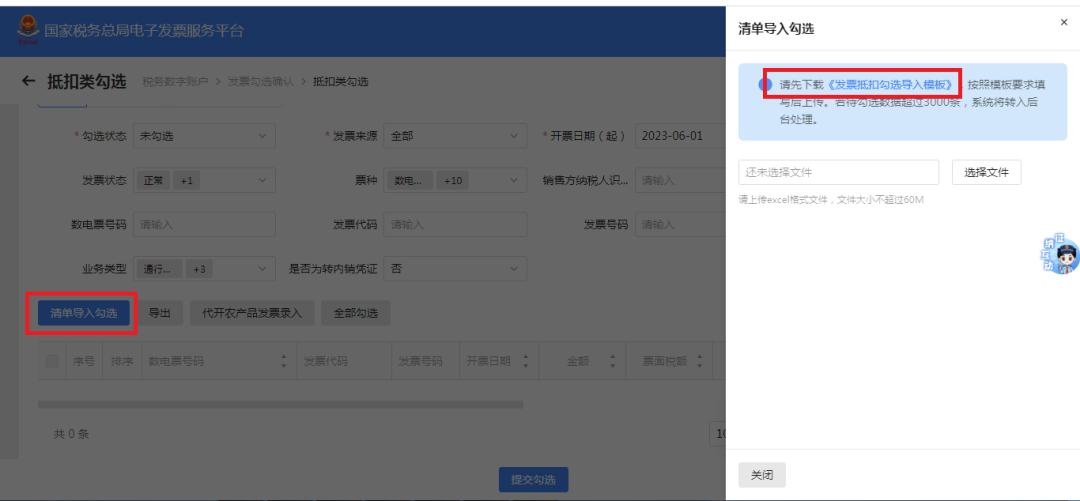 若勾选发票数量较多也可按照模板要求填写后上传。
