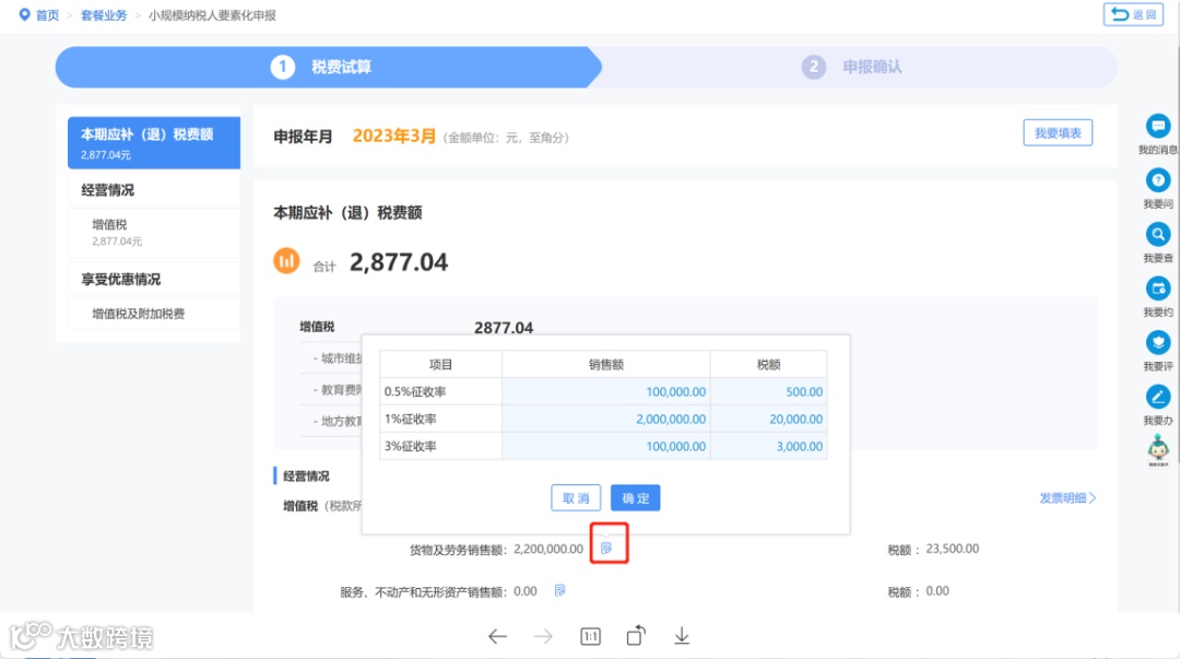 2.若纳税人根据实际经营情况需要调整相关要素数据,可进行编辑调整,如存在未开票收入情况,纳税人可将未开票收入分货物、服务分别进行补录。输入完成后点击“确定”按钮。