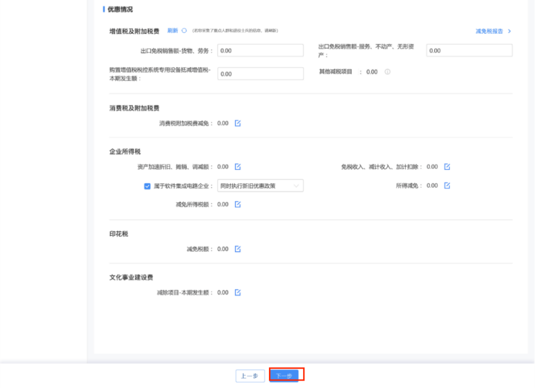 答:纳税人可在税费试算页面享受优惠情况点击【税收减免报告】进行优惠信息采集。
