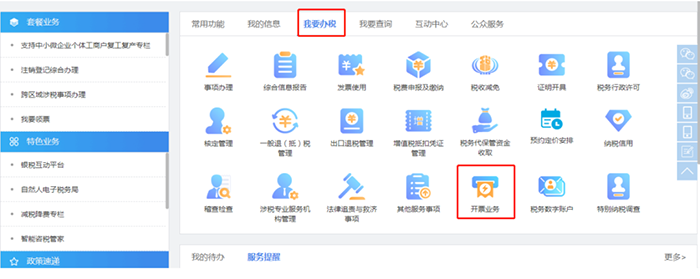 (一)登录电子税务局,依次点击【我要办税】-【开票业务】;