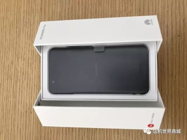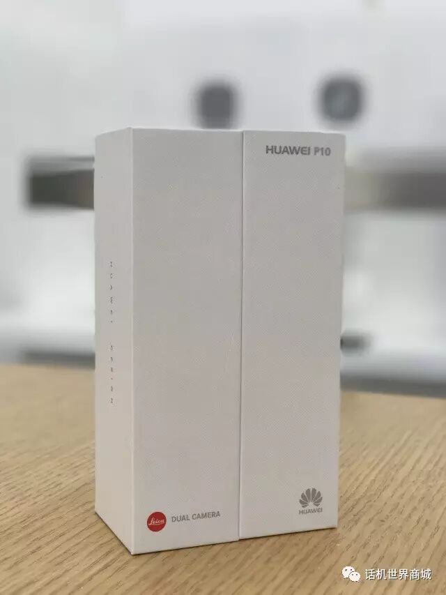 白色的包装盒,左边是红色的徕卡logo,右边是浅灰的华为logo,右上角是本款手机的名称——华为P10。
