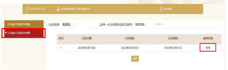④点击页面左侧【公司减少注册资本查看】,可以查看/打印减资信息。