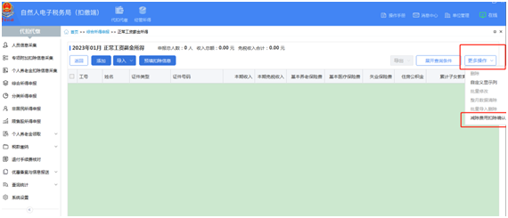 ② 依次点击【综合所得申报】-【正常工资薪金所得】-【收入和减除费用填写】页面-选择该员工,点击右上角【更多操作】-【减除费用扣除确认】-把【是】改为【否】,点击确认。