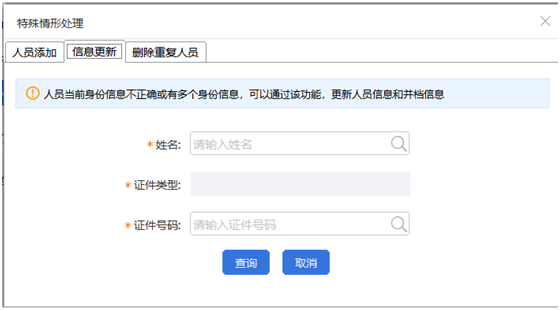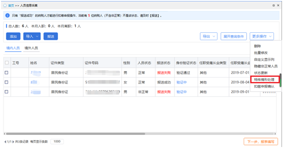 ② 点击【人员信息采集】—【更多操作】—【特殊情形处理】—【信息更新】,即可实现把之前证照号码的申报数据累计到新的身份信息上。