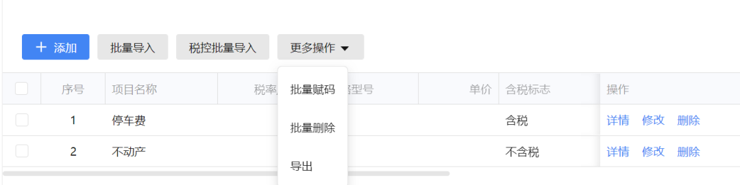 纳税人可以批量导入、税控批量导入项目信息;也可以对已添加的项目信息批量赋码、批量删除或导出。