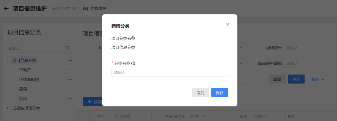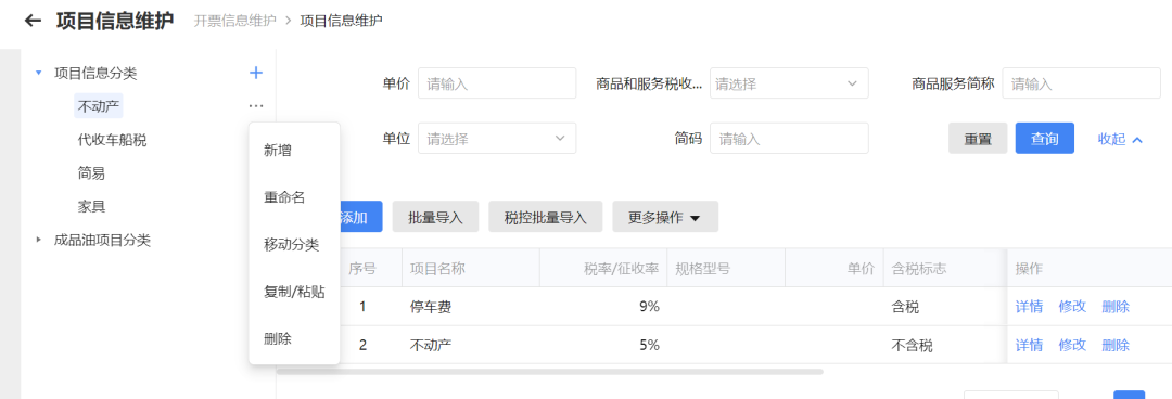 纳税人也可以对已有的项目信息分类新增下级分类、重命名、移动分类、复制、粘贴或删除。