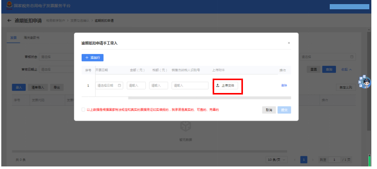 第六步:在逾期抵扣申请手工录入界面填写正确的发票信息后,点击“上传文件”。