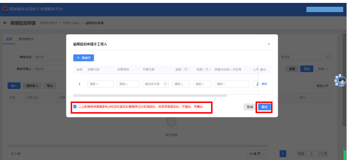 第九步:所有发票录入完毕后,勾选承诺,点击提交。