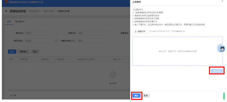 第七步:在右侧弹出框内,点击“选择文件”,选择所需的办理材料(也可以直接拖拽到指定区域),点击“上传”,上传成功后点击“确定”。