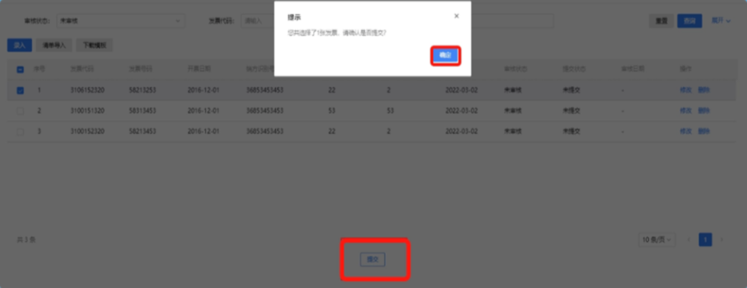 第十一步:待主管税务机关受理完成后,选中需要提交申请的发票信息,点击“提交”按钮后,提示“您共选择x张发票,请确认是否提交”,点击“确定”按钮后,提示“逾期抵扣申请提交发票成功!”,等待主管税务机关审核即可。