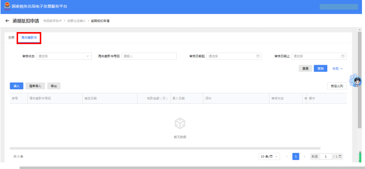 1.海关缴款书的逾期抵扣申请在进入逾期抵扣申请界面时点击“海关缴款书”即可。