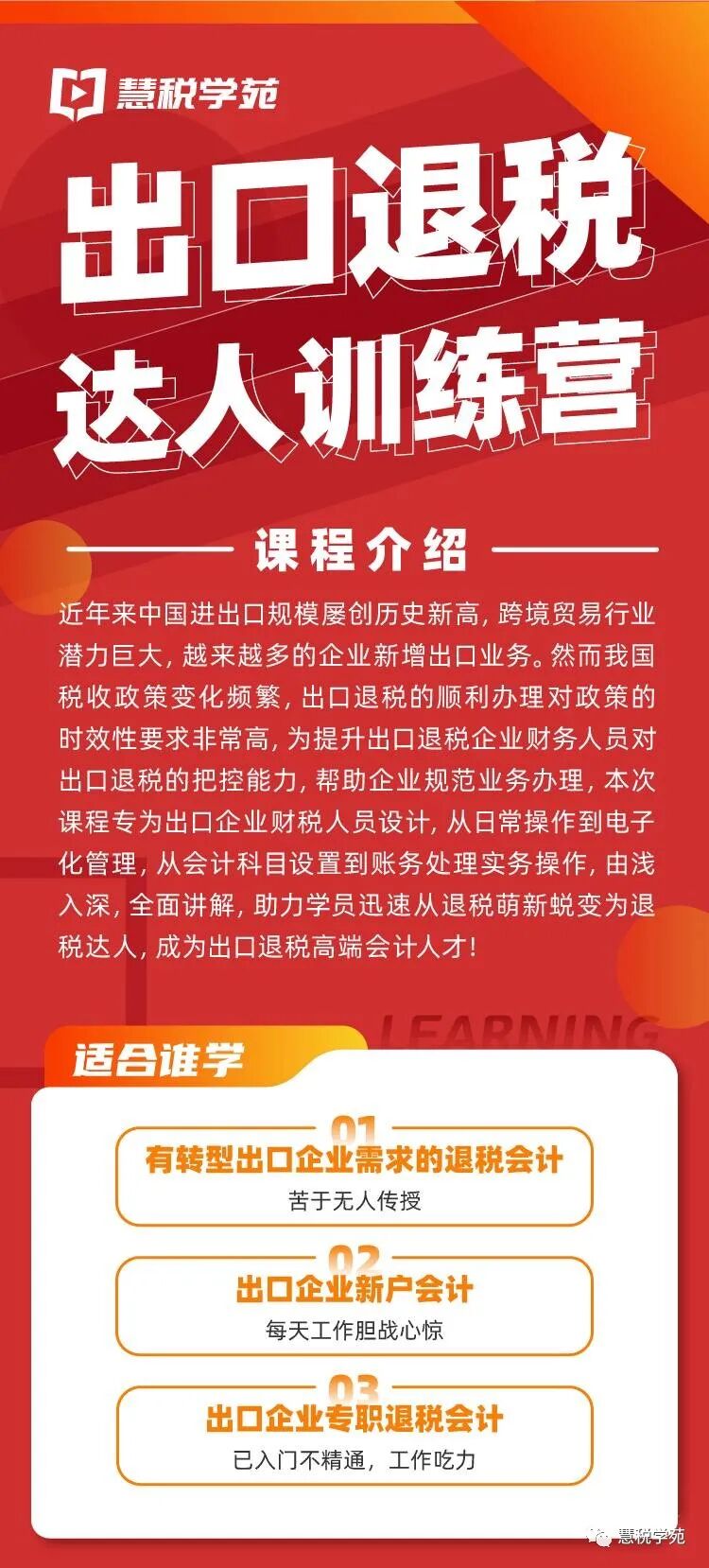 针对以上出口退税相关热点问题,慧税学苑重磅推出《出口退税达人特训营》!只需10个小时,帮你完成从退税萌新到退税达人的蜕变!