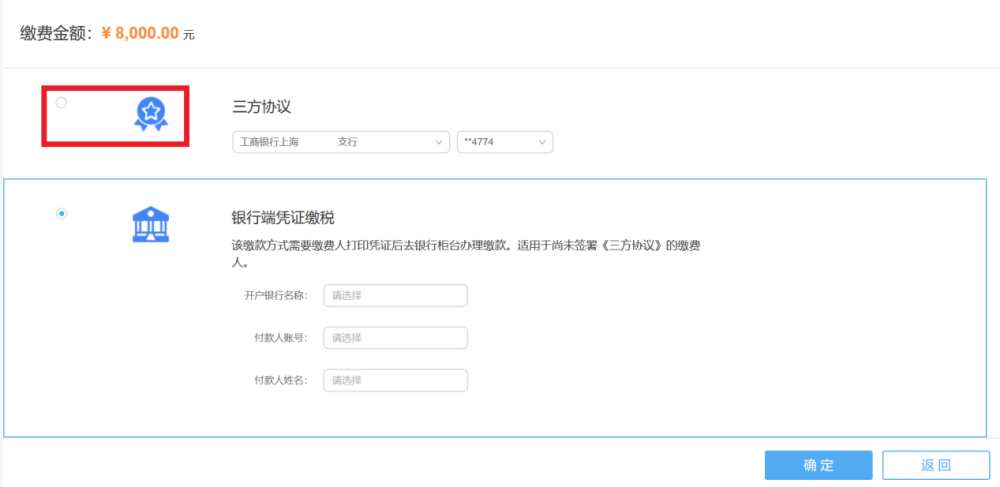 4.在缴费界面再次确认待缴金额无误后,选择缴款方式,已签订三方协议的企业可选择【三方协议扣款】,未签订三方协议的企业可选择【银行端凭证缴税】。确认付款方式后,点击【确定】。