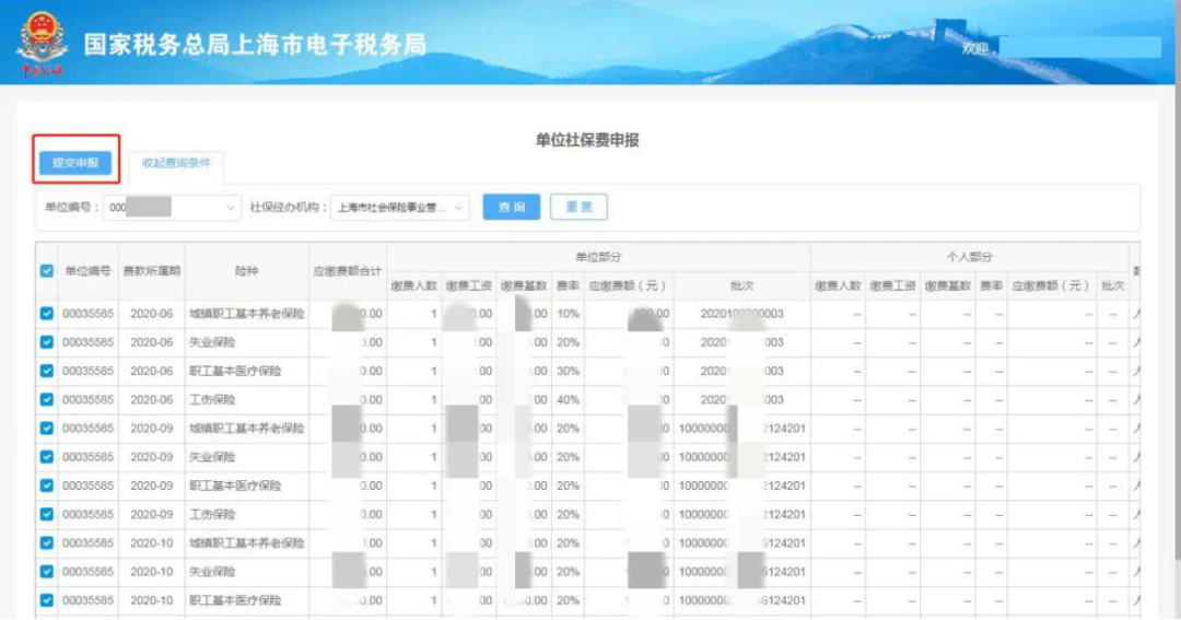 2.选中要申报的行次,核对信息无误后点击【提交申报】。同一批次的社保费需要同时进行申报,选中一条后,系统将自动将此批次其他的险种同时选中。