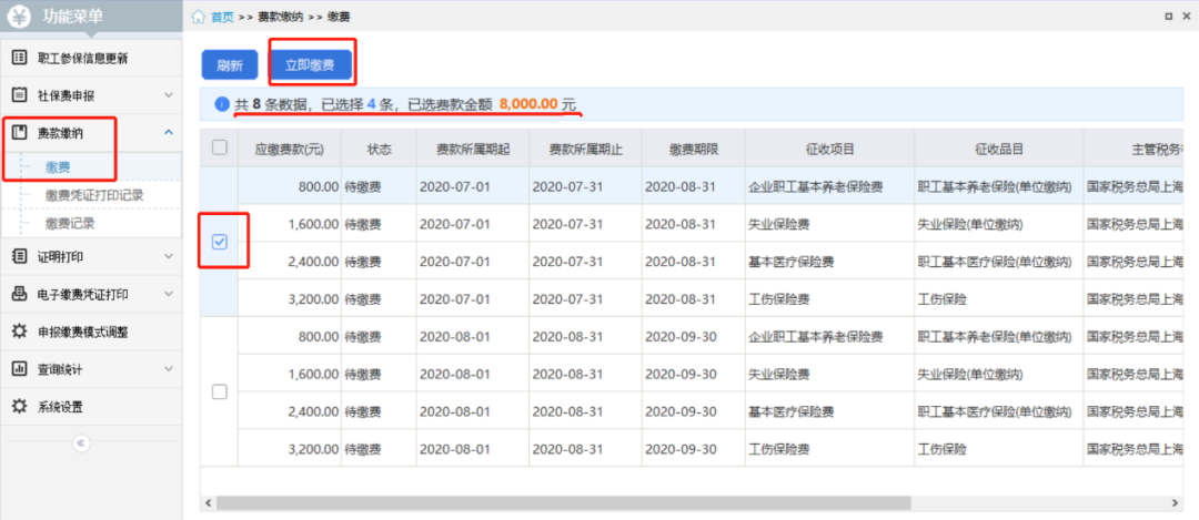 3.申报成功后,进入【缴费】界面,缴费单位核对应缴费款明细,确认无误后点击【立即缴费】。