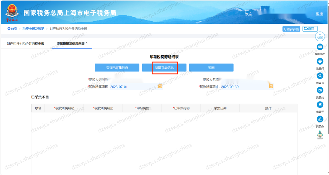 3.进入印花税税源明细表,点击【新增采集信息】。