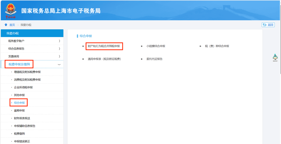 1.登录上海市电子税务局,点击【我要办税】—【税费申报及缴纳】—【综合申报】—【财产和行为税合并申报】。