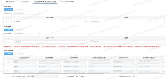 5.注册资本、注册资本明细(币种、金额)、投资总额、投资总额明细(币种、金额)、投资方(投资方名称、投资比例、投资方证件种类、投资方证件号码、国家或地区代码、地址、投资方主体类型、投资有效期起、投资有效期止);