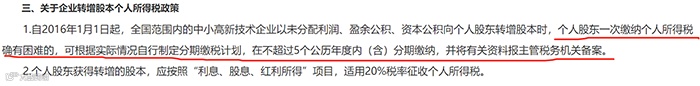 自2016年1月1日起,全国范围内的中小高新技术企业以未分配利润、盈余公积、资本公积向个人股东转增股本时,个人股东一次缴纳个人所得税确有困难的,可根据实际情况自行制定分期缴税计划,在不超过5个公历年度内(含)分期缴纳,并将有关资料报主管税务机关备案。