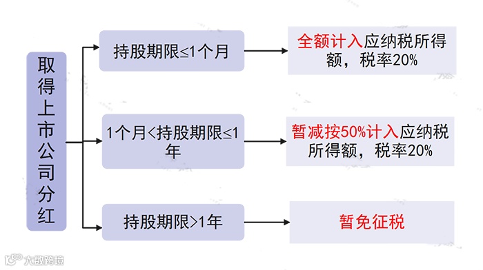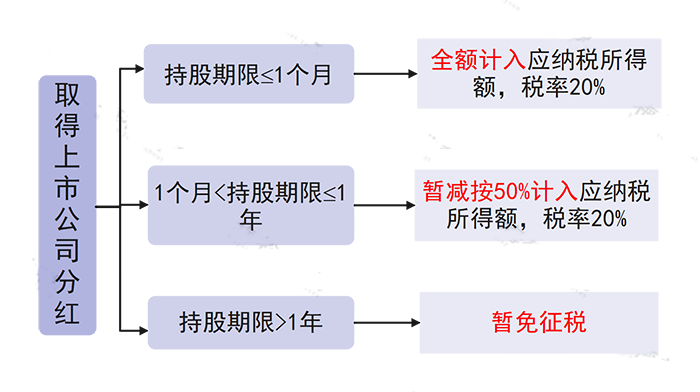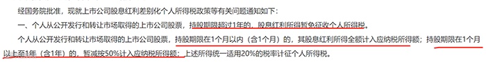 个人从公开发行和转让市场取得的上市公司股票,持股期限在1个月以内(含1个月)的,其股息红利所得全额计入应纳税所得额;持股期限在1个月以上至1年(含1年)的,暂减按50%计入应纳税所得额;上述所得统一适用20%的税率计征个人所得税。