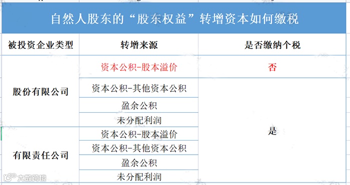 2、股东为自然人的,除了被投资单位是股份制企业的情况下,以资本公积——股本溢价转增资本是不交个税之外,其他情况(比如未分配利润转增资本),要按照“利息、股息、红利”所得缴纳20%的个人所得税。