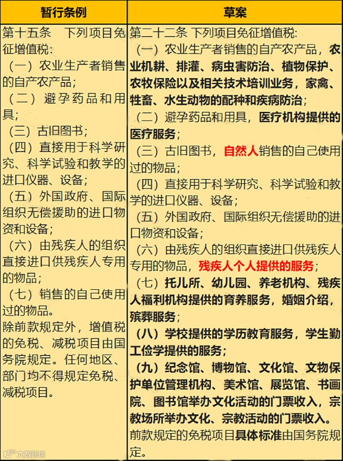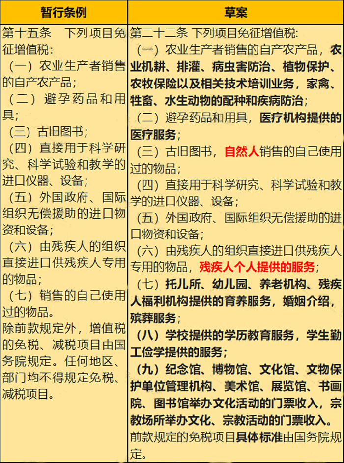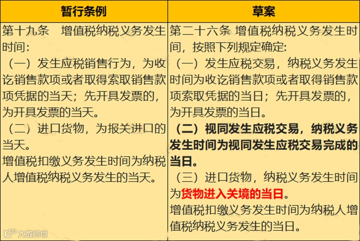 对于目前的“代销”、“移送”、“用于非税项目”、“投资”和“分配”都被移除。并且,关于赠送,也未提及“用于公益事业的除外”。