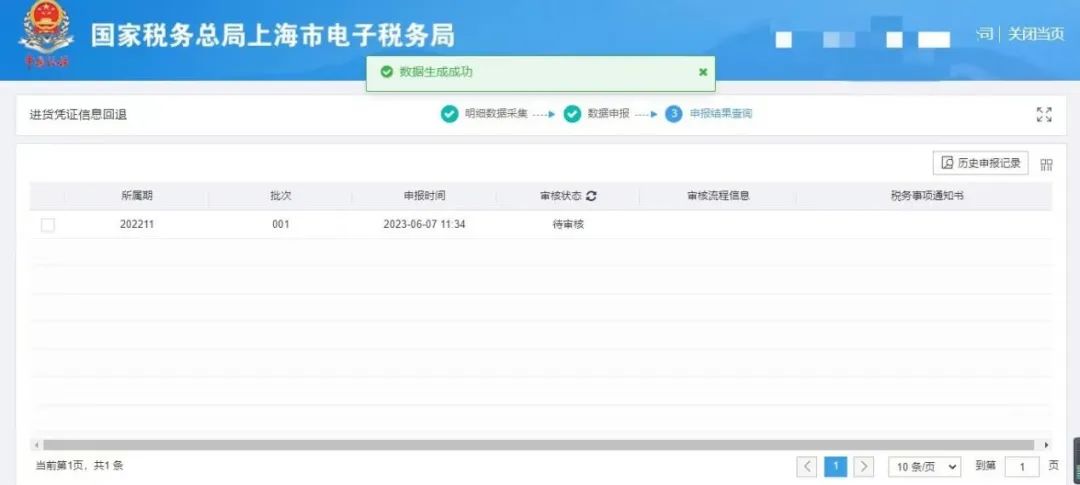 第七步:显示“数据生成成功”,审核状态显示“待审核”;