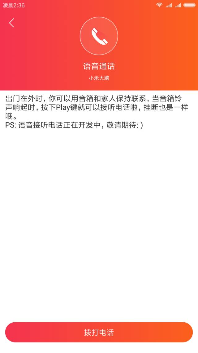 出门在外,你可以通过小爱和家人随时免费通话。在小米AI App中选择“语音通话”,家里的小爱同学就能响起电话铃声,点击“Play”键就能接听!此功能只消耗手机流量,不会扣除通话费用。