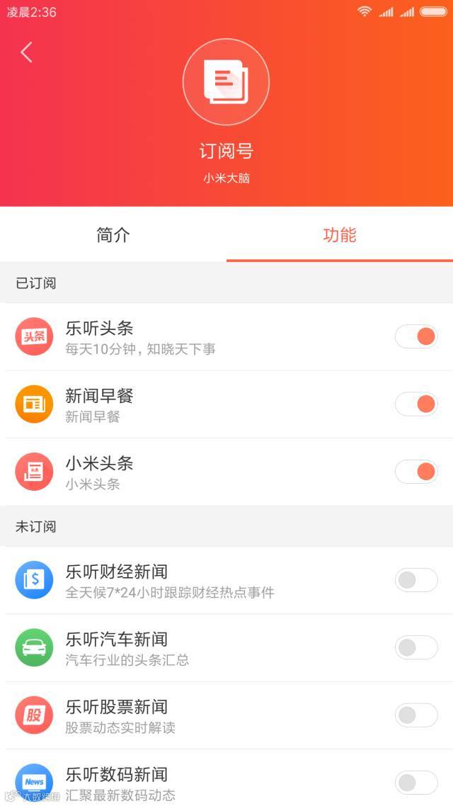 订阅号是小米大脑开发的新闻播报功能,在小米AI App技能中心找到订阅号(生活分类中),在这里可以订阅财经、汽车、股票、数码、军事、社会、房产、体育、科技、娱乐、国际等众多内容。对小爱说“打开订阅号”试试吧~