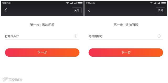 分别创建不同的问题“开启床头灯”、“打开厨房灯”,然后各自选择控制对应的同款设备就可以啦 ▼