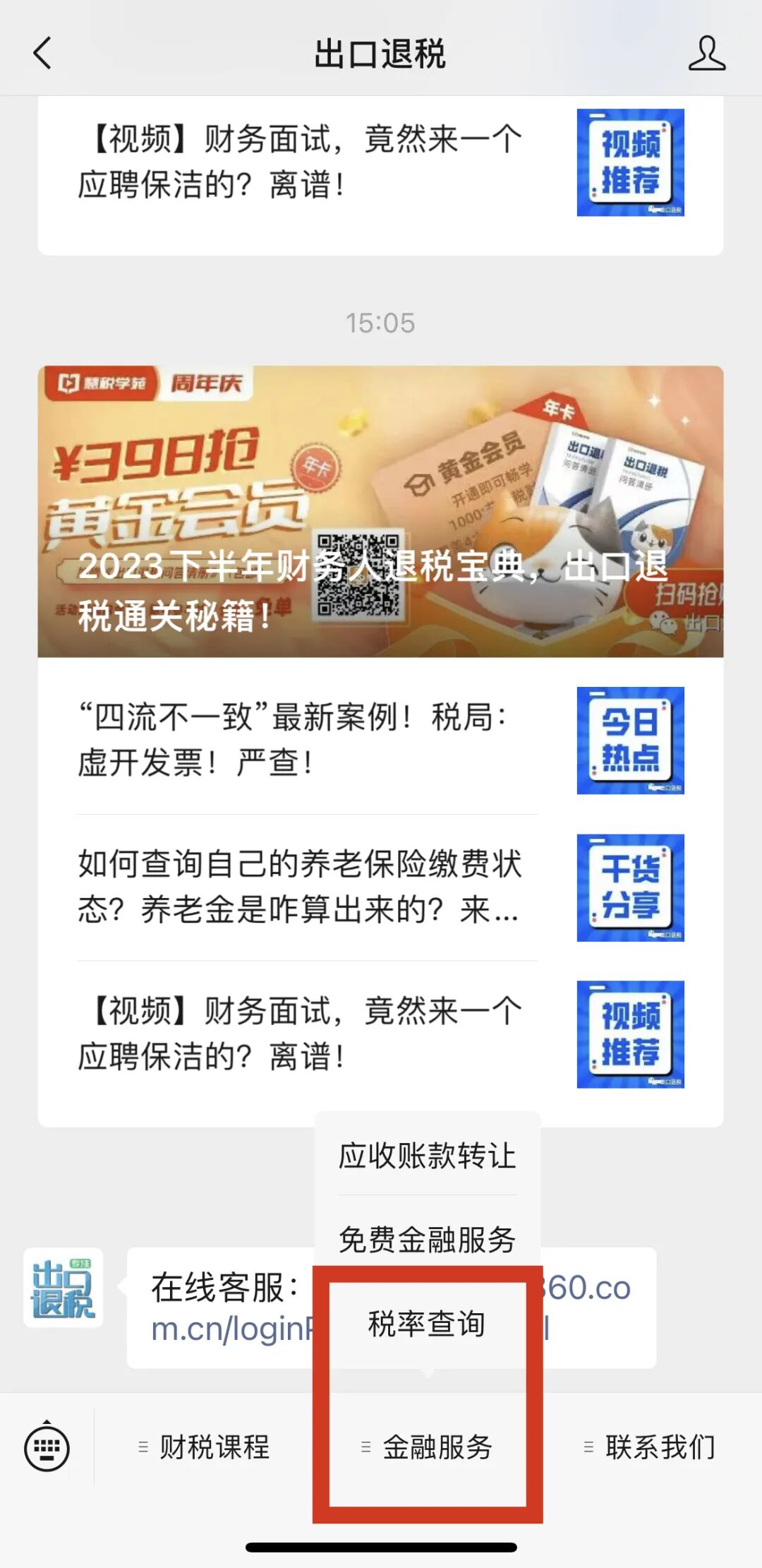 1.网页搜索【出口退税咨询网】(http://taxrefund.com.cn/?)或微信关注【出口退税】公众号点击【金融服务】—【税率查询】