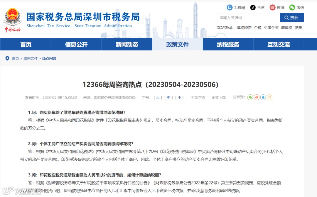 5月8日,深圳市税务局发布最新回复,明确了个体工商户书立的动产买卖合同是否需要缴纳印花税。
