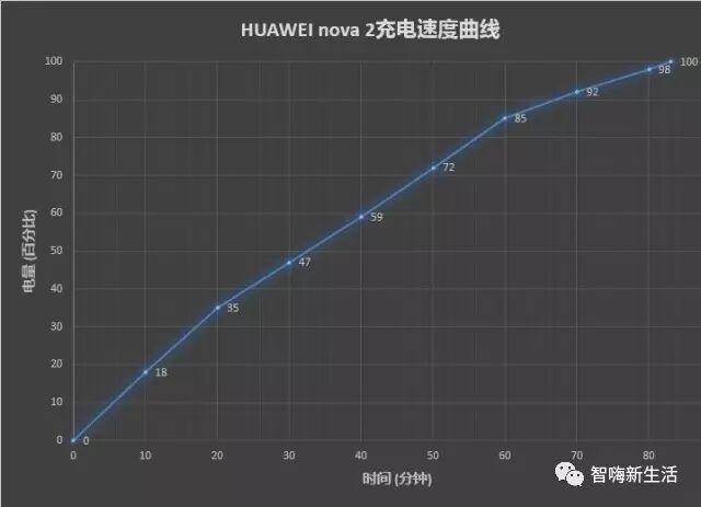 HUAWEI nova 2配备了2950mAh电池,支持QuickCharge快充技术,最高充电功率为18W,下面我们对其进行充电测试。