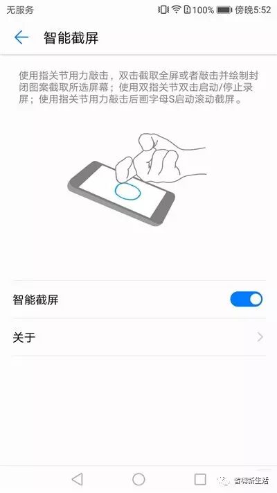 使用指关节用力敲击,双击截取全屏或者敲击并绘制封闭图案截取所选屏幕。使用双指关节双击启动/停止录屏。使用指关节用力敲击后画字母S启动滚动截屏。