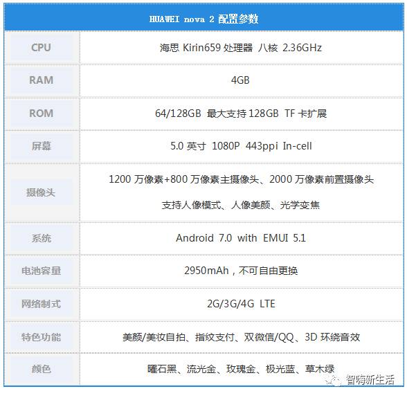 HUAWEI nova 2搭载了麒麟659处理器,8核心CortexA53架构,采用4个大核+4个小核设计,最高主频为2.36GHz,基于16nm工艺打造。