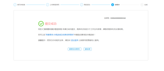 提交成功的事项可以在“我要查询—办税进度及结果信息查询”中进行查询受理状态。