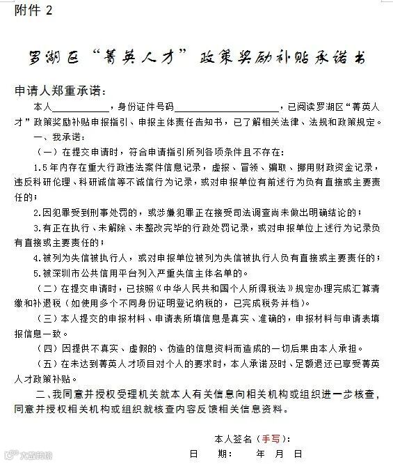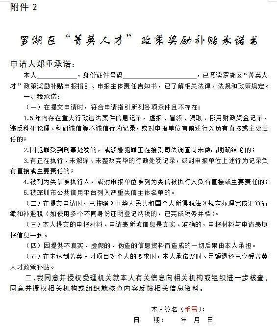 2.罗湖区“菁英人才”政策奖励补贴承诺书