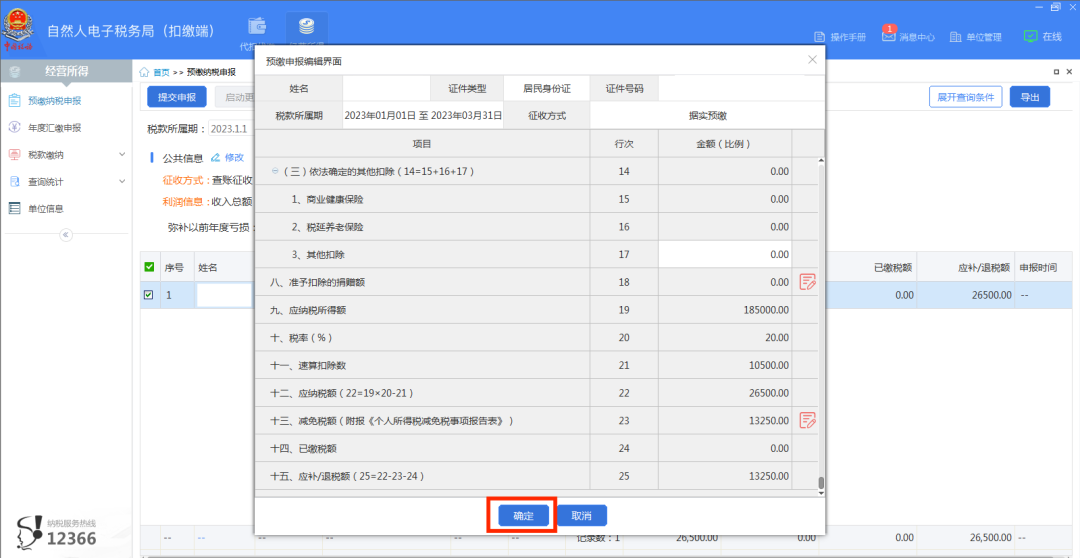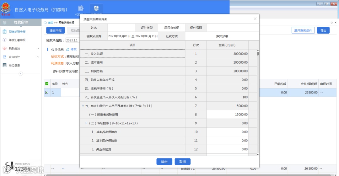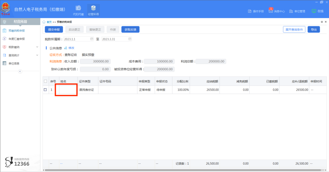 第二步:点击申报表填写主界面下方对应投资者的姓名,进入“预缴申报编辑界面”。