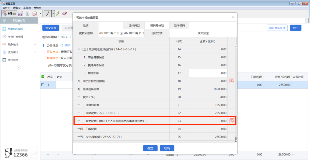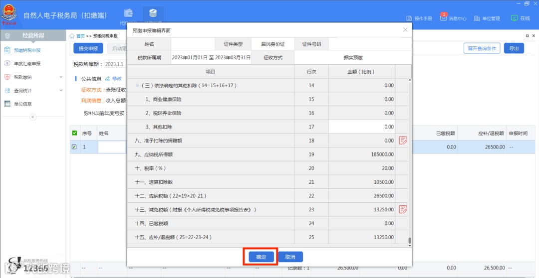 选择完毕后,系统会自动填入减免税额=(185000*20%-10500)×(1-50%)=13250元,点击【确定】。