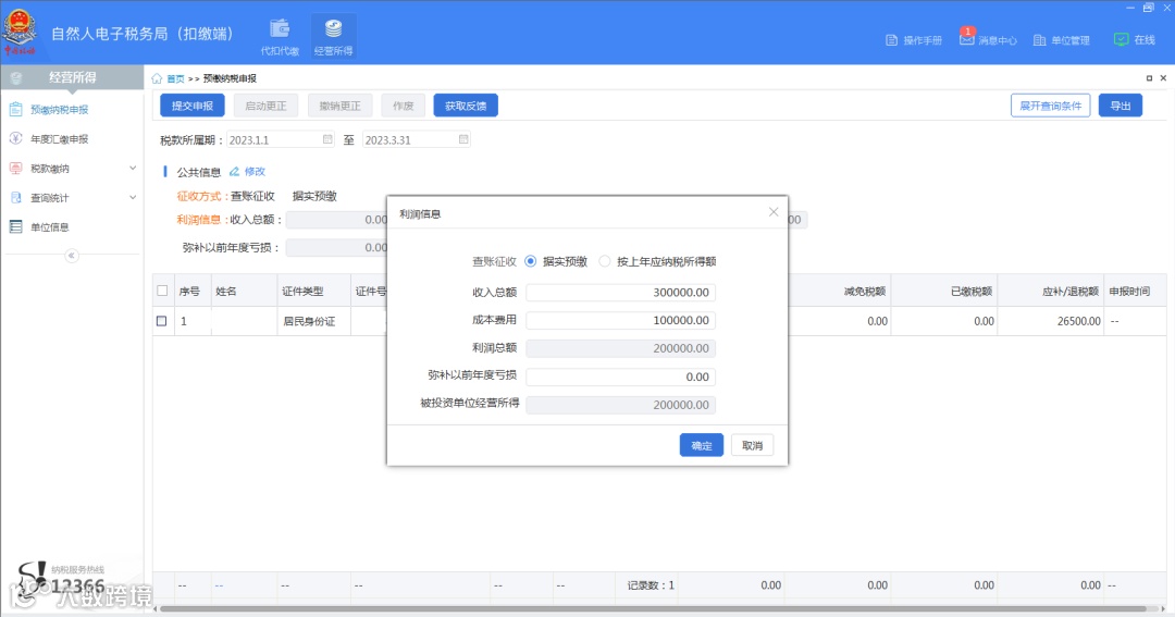 在表单中填报收入总额30万元,成本费用10万元,系统将自动计算利润总额为20万元。填写完毕后,点击【确定】。